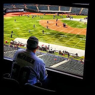 We dressed in our outdated by good luck Raider jerseys, poked a flower in my updo and jumped in the truck right around 8:30 a.m.